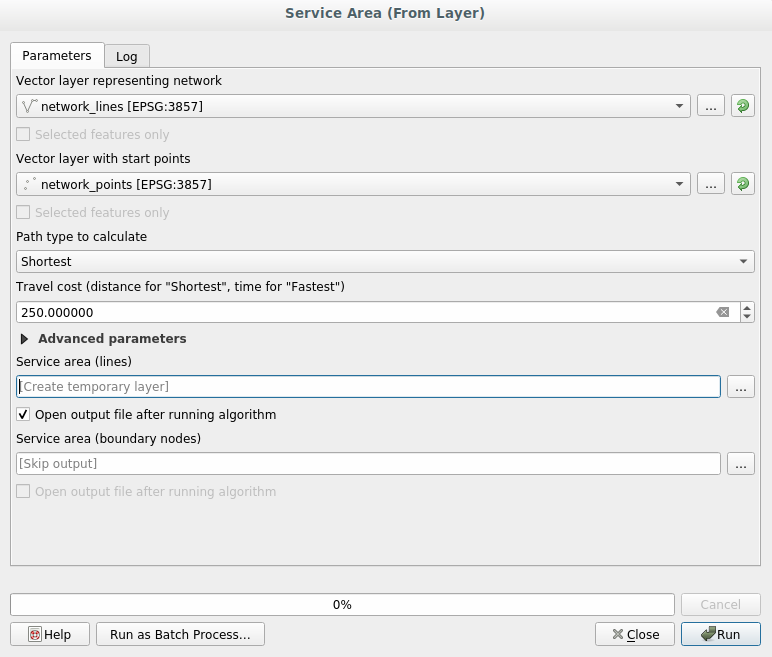 Select network_lines for the Vector layer representing network parameter