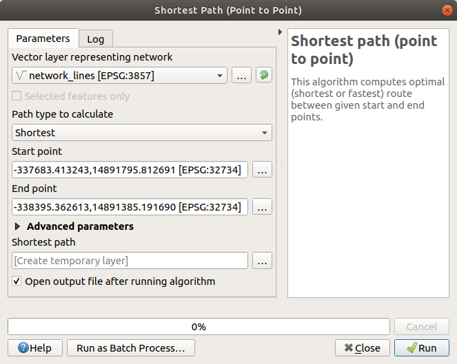 A new line layer is created representing the shortest path between the chosen points. Uncheck the