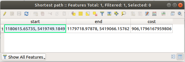 Open the attribute table of the output layer. It contains three fields, representing the coordinates of the start and end points and the cost.
