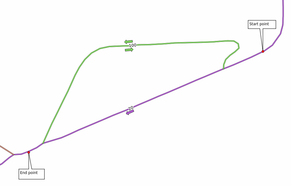 we would like to know the fastest route considering the speed limits of each road (the labels represent the speed limits in km/h). The shortest path without considering speed limits would of course be the purple path. But in that road the speed limit is 20 km/h, while in the green road you can go at 100 km/h!