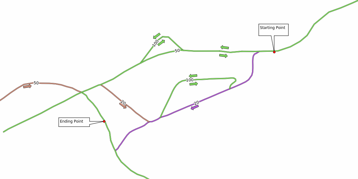 The shortest path tools provide ways to calculate either the shortest or the fastest path between two points of a network, given: