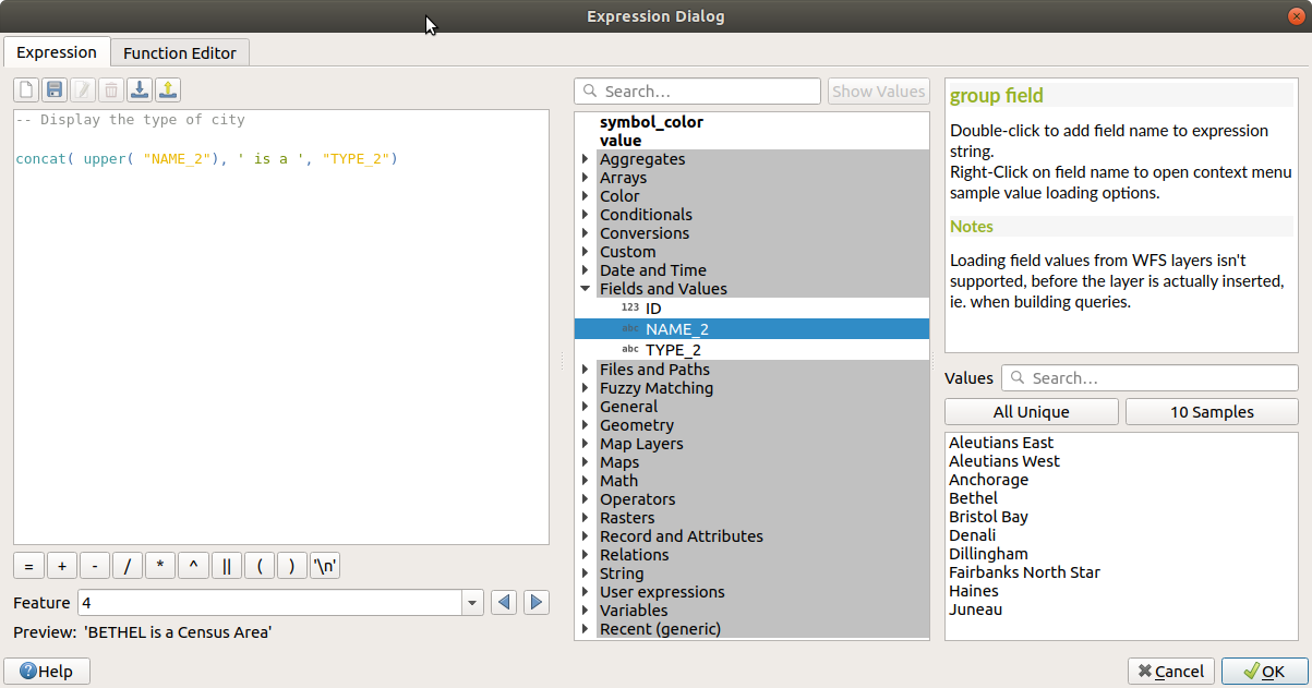 a live Output preview of the expression, evaluated on the first feature of the Layer by default. You can browse and evaluate other features of the layer using the Feature combobox (the values are taken from the display name property of the layer).