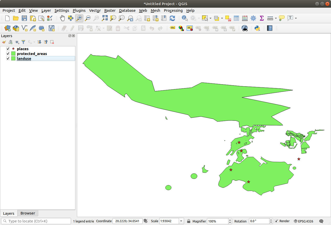 For this exercise, you can either use the basic map you made at the start of the course, or just start a new map and load some existing layers into it. For this example, we used a new map and loaded the original places, landuse and protected_areas layers and adjusted the symbology: