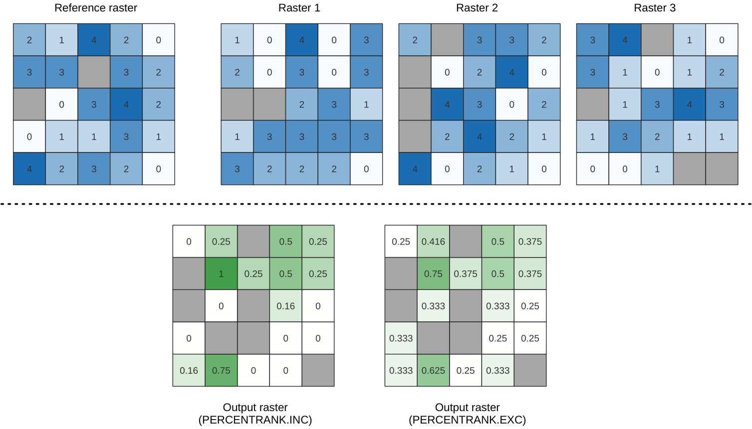 At each cell location, the current value of the value raster is ranked among the respective values in the stack of all overlaid and sorted cell values of the input rasters. For values outside of the the stack value distribution, the algorithm returns NoData because the value cannot be ranked among the cell values.