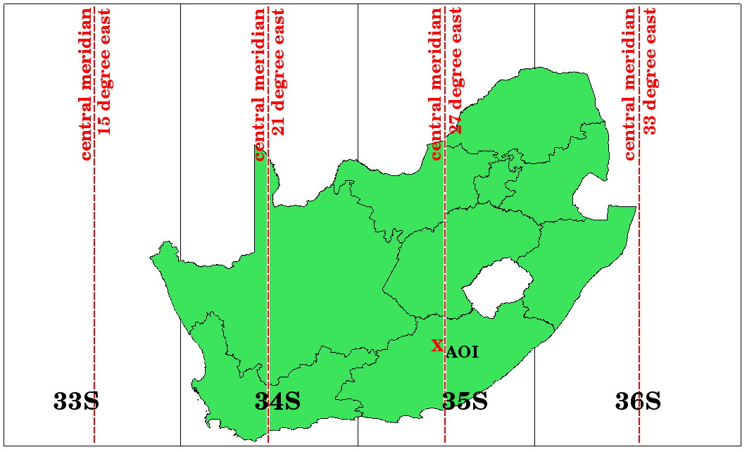 Fig. 8.54 Les Projections UTM 33S, 34S, 35S et 36S, avec leur longitude centrale sont utilisés pour représenter l’Afrique du Sud avec une bonne précision. La croix rouge localise une Zone d’Intérêt (ZI).