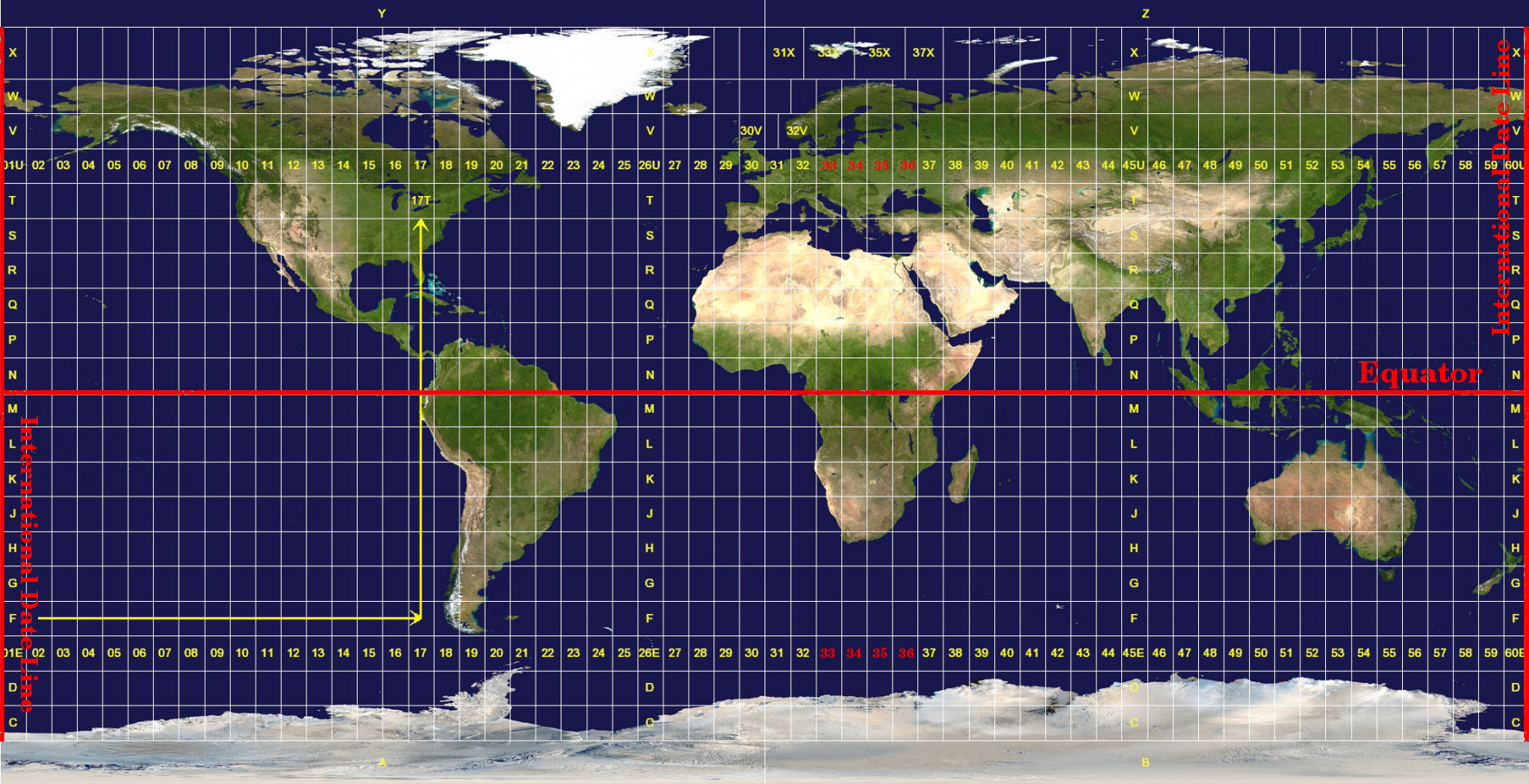 L’endroit que nous recherchons est à 3 550 000 mètres au sud de l’équateur, de sorte que la valeur d’ordonnée (Y) obtient un signe négatif et est de -3 550 000 m. Selon les définitions UTM, nous devons ajouter une fausse valeur d’ordonnée de 10 000 000 m. Cela signifie que la valeur d’ordonnée (Y) de notre coordonnée est de 6 450 000 m (-3 550 000 m + 10 000 000 m).