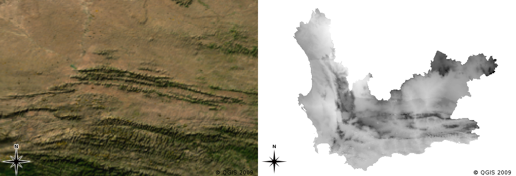 Fig. 6.9 Les véritables images raster de couleur (à gauche) sont utiles car elles fournissent beaucoup de détails qui sont difficiles à capturer avec des entités vectorielles mais facile à voir lorsqu’on regarde une image raster. Les données raster peuvent aussi être des données non-photographiques, comme la couche raster sur la droite qui montre la température minimale moyenne calculée dans le Western Cape pour le mois de mars.