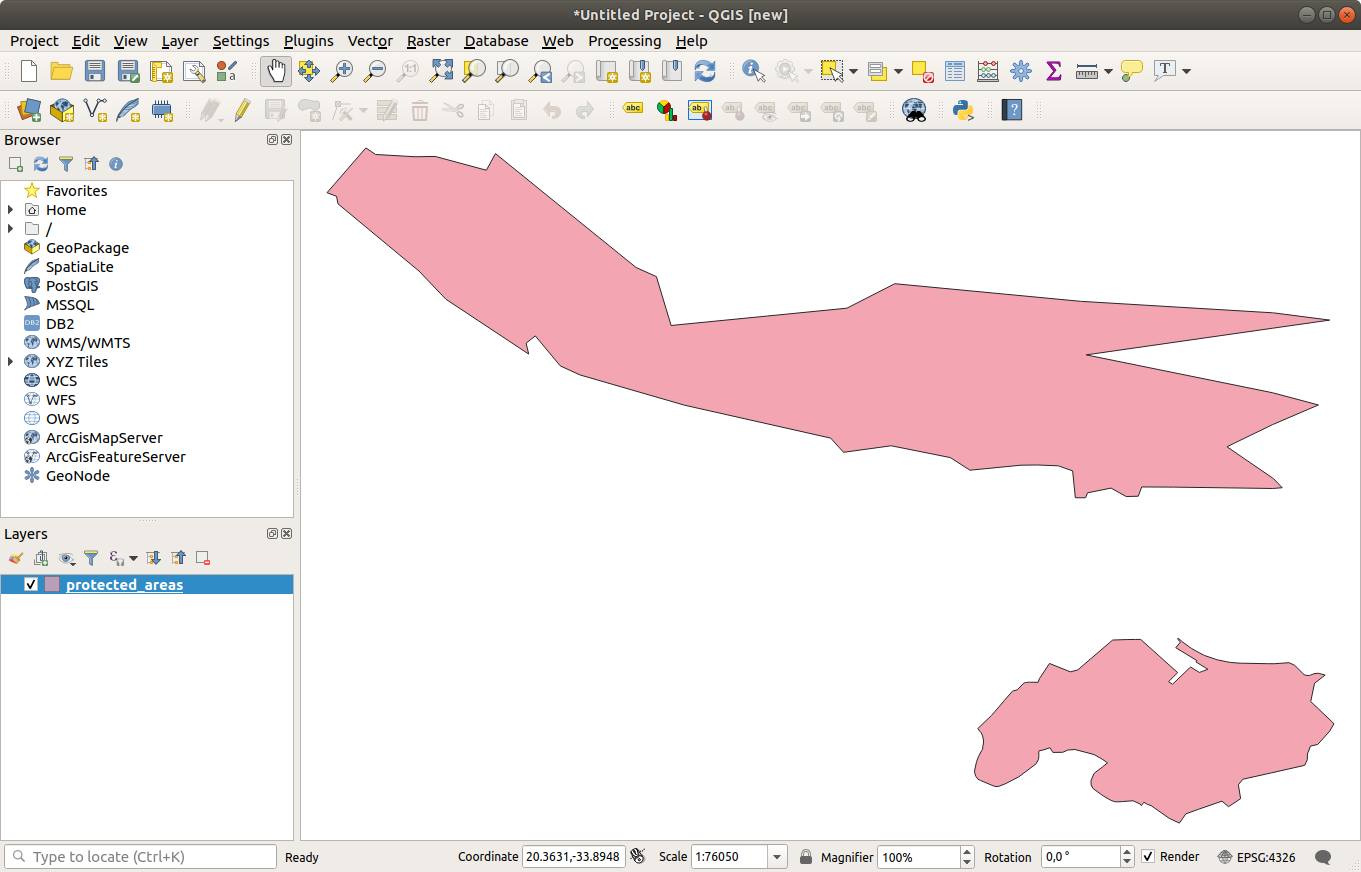 protected_areasdans le panneau couches (en bas à gauche) avec ses entités affichées dans le canevas de la carte principale.