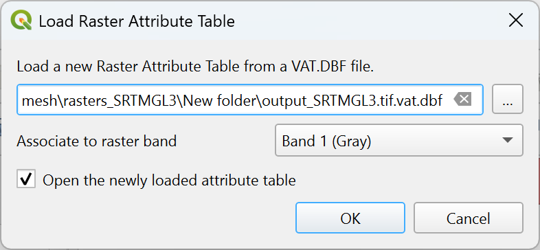Load attribute table from VAT.DBF file: retrieves the attribute table from an external DBF file. Load Raster Attribute Table dialog will appear to let you browse and select the DBF file and associate it with the raster band. The action also can be done by right-clicking the raster layer in the layers panel and selecting