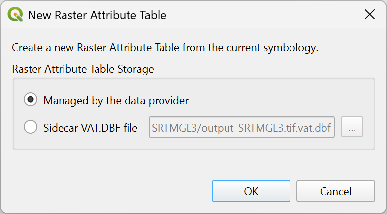 Click this button and set the following options in the New Raster Attribute Table dialog.Managed by the data provider: the attribute table will be saved and managed by the data provider (if supported), overwriting any existing table for the raster band used by the current style. Depending on the data provider, the attribute table will be embedded in the main raster file or saved into a sidecar file managed by the data provider.